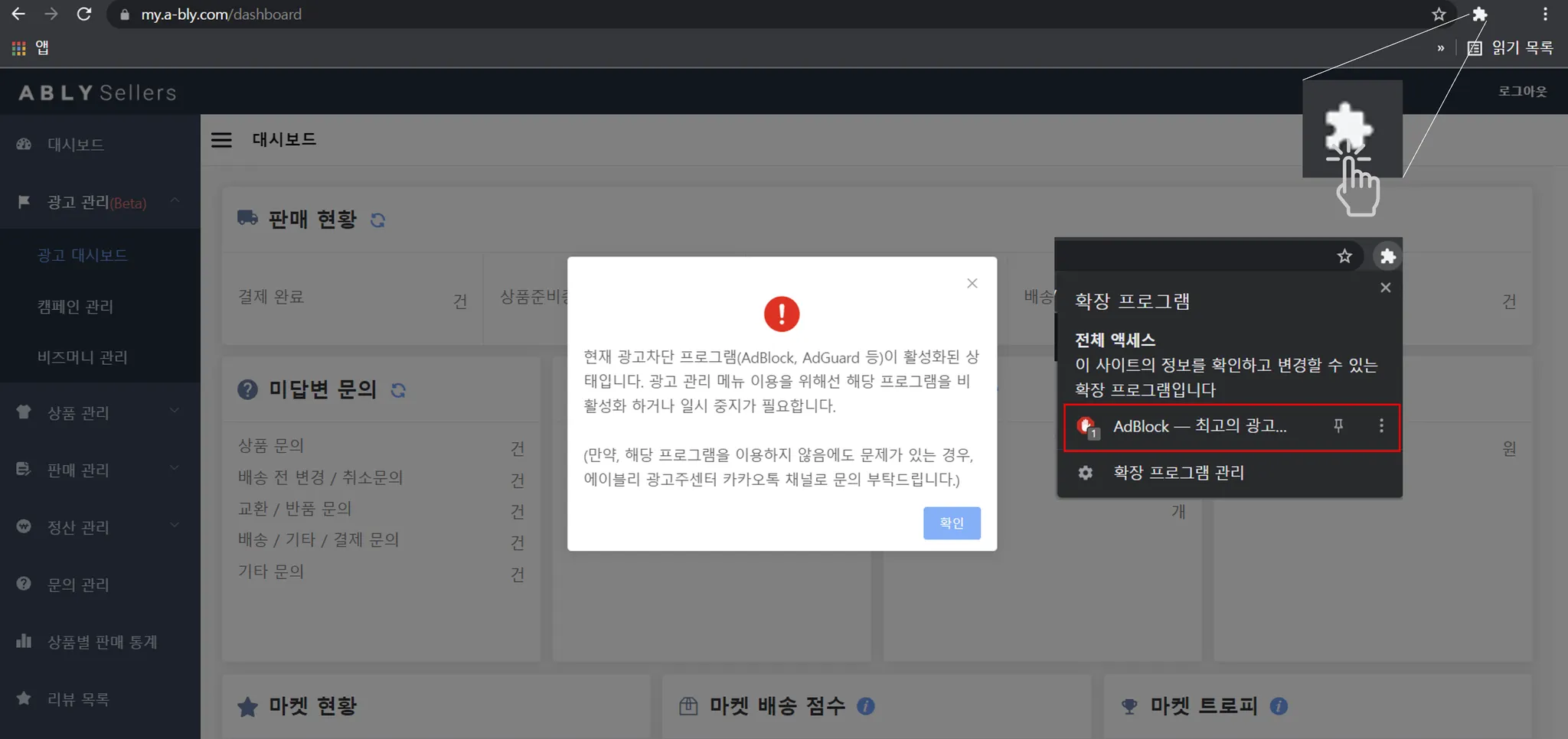1) 이 사이트에서 일시 중지 : 에이블리 [내 마켓 관리 사이트]에서는 광고 차단 기능이 중지됩니다.