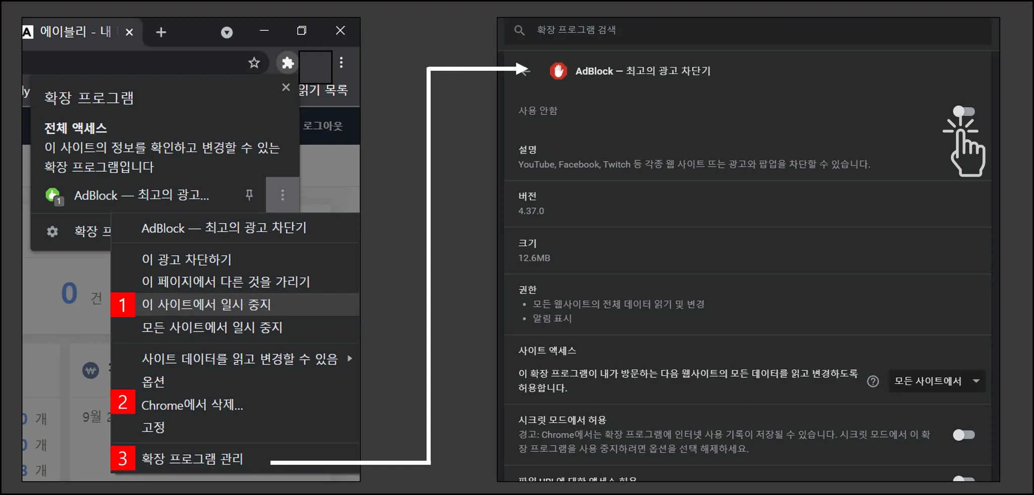 해당 확장 프로그램을 중지하는 방법은 크게 3가지가 있습니다.