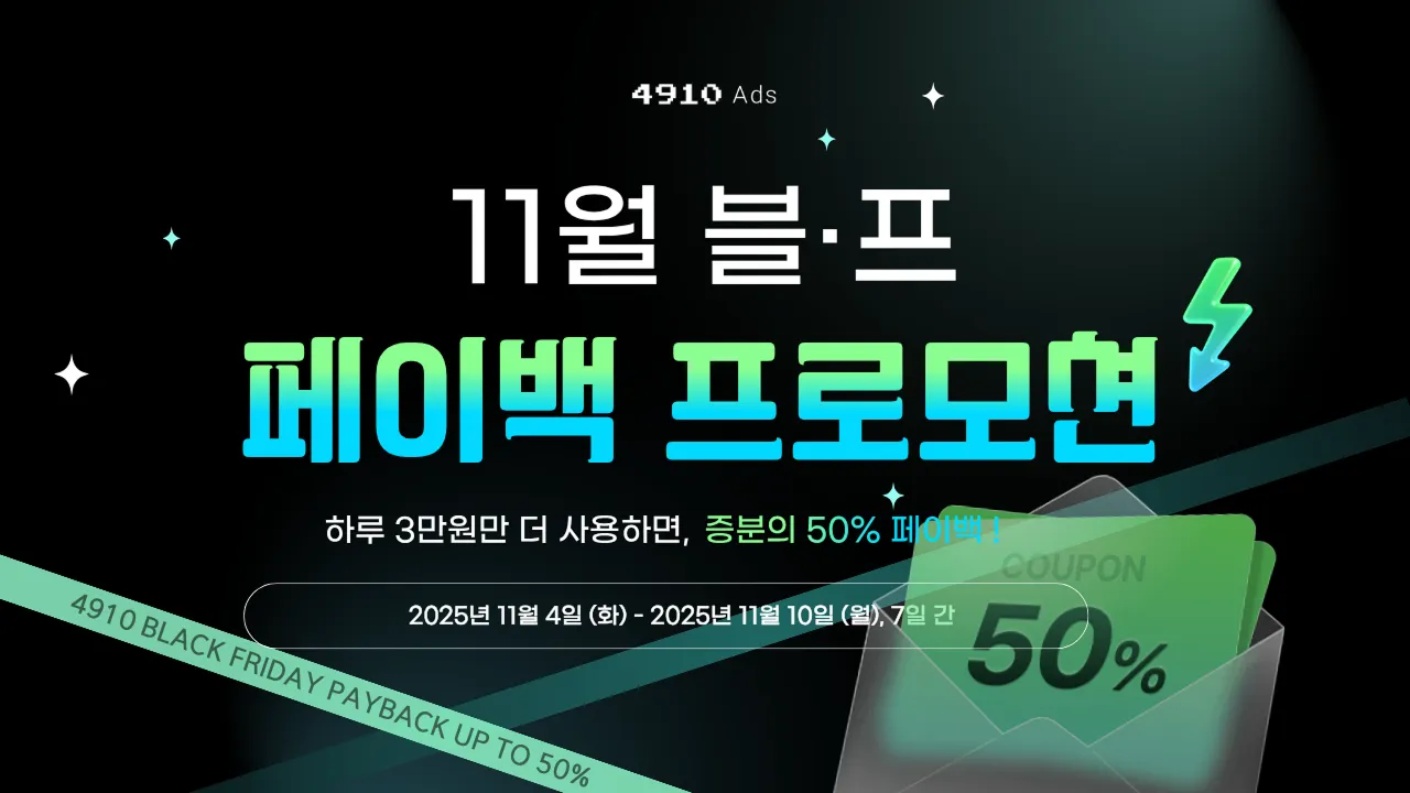 연 중 최대 행사 기간에 맞춰, 광고를 통해 더 큰 성과를 달성하실 수 있도록 4910 광고팀에서 페이백 프로모션을 준비했습니다