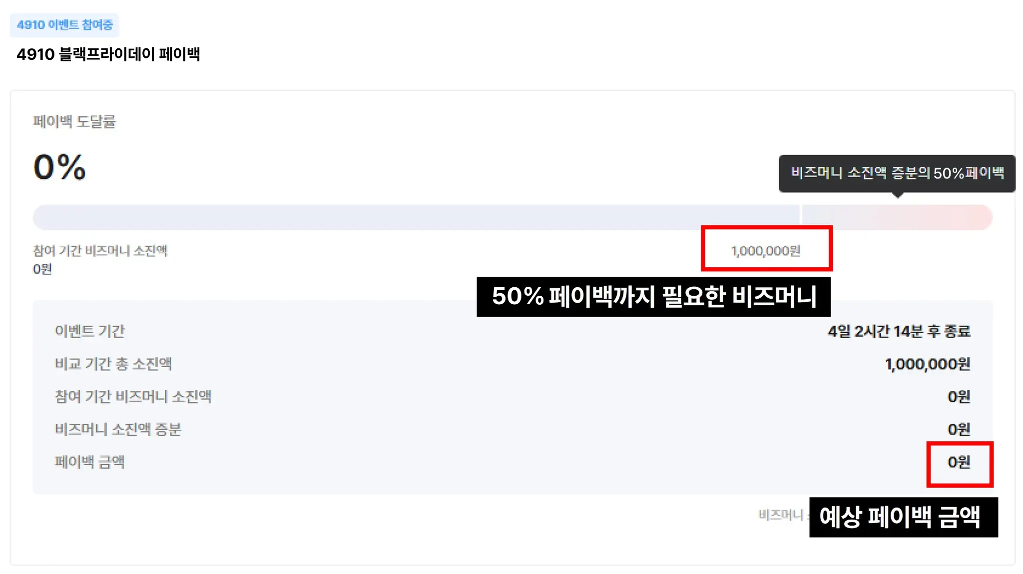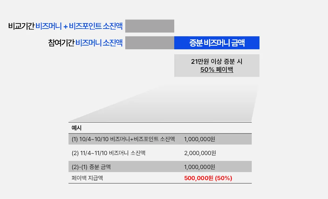 참여 기간 동안 비즈머니 기준으로 21만 원 이상 소진하면, 증분의 50%를 금액 한도 없이 페이백