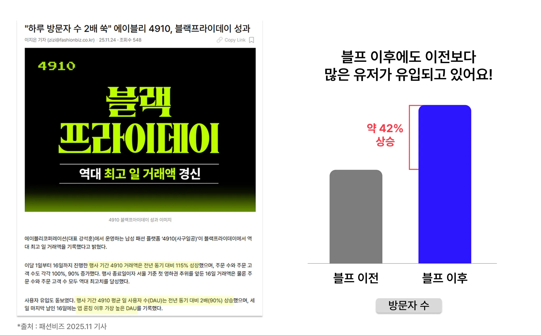 11월 1일부터 16일까지 진행된 4910 블랙프라이데이는 전년 동기 대비 115% 성장한 성과로 마무리됐어요. 이렇게 블랙프라이데이를 통해 유입된 유저들은 여전히 4910앱에 꾸준히 방문하고 있습니다.
