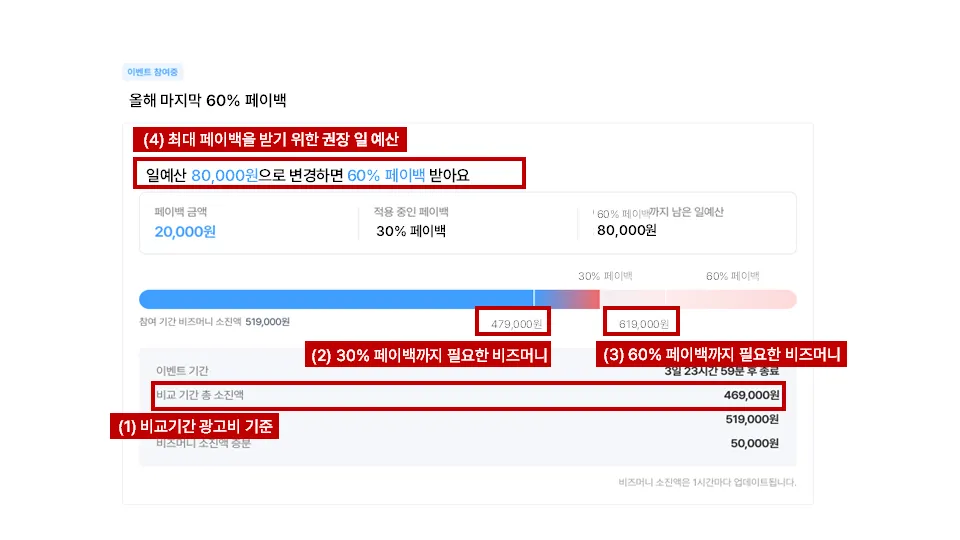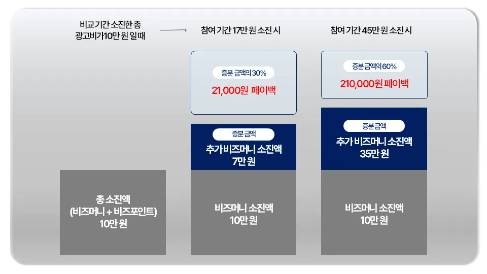 참여 기간 동안 비즈머니 기준으로 35만 원 이상 더 소진하면, 증분의 60%를 금액 한도 없이 페이백