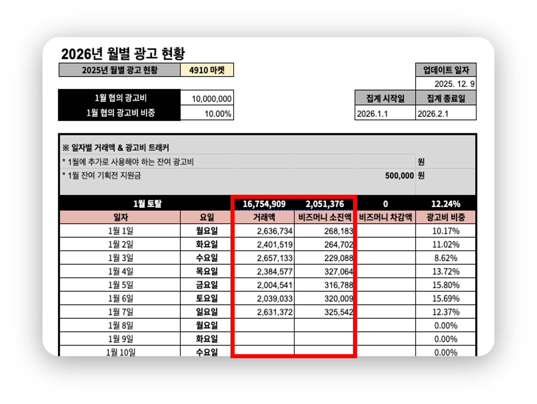 개별로 제공드리는 월별 광고 현황 시트의 ‘거래액*’과 ‘비즈머니 소진액’ 항목에서 셀러님의 데이터를 직접 확인하실 수 있습니다.