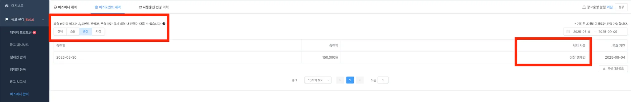 셀러 어드민 > 광고 관리 > 비즈머니 관리 > 비즈포인트 내역 > 충전에서 비즈포인트 지급 사유(처리 사유)와 유효기간을 확인할 수 있습니다.