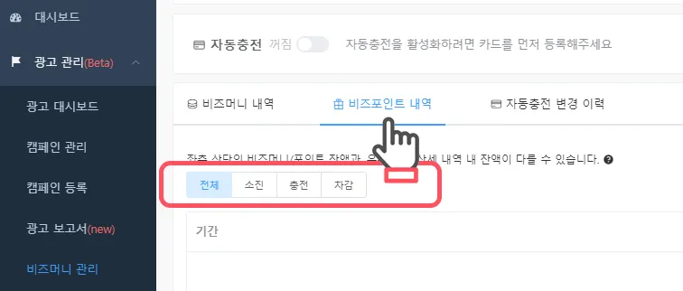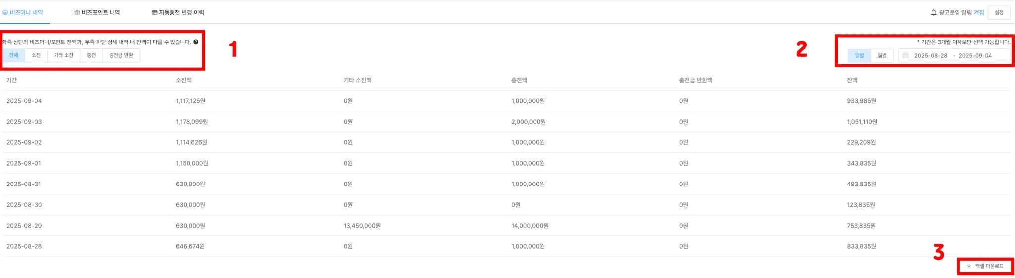 비즈포인트 내역은 [셀러어드민 - 광고 관리 - 비즈포인트 관리 - 비즈포인트 내역]에서 확인할 수 있습니다.