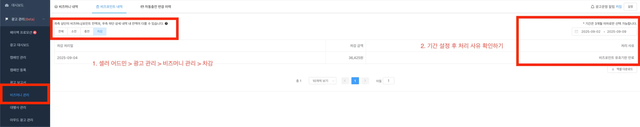 셀러 어드민 > 광고 관리 > 비즈머니 관리 > 비즈머니 / 비즈포인트 내역 > 차감 버튼 클릭