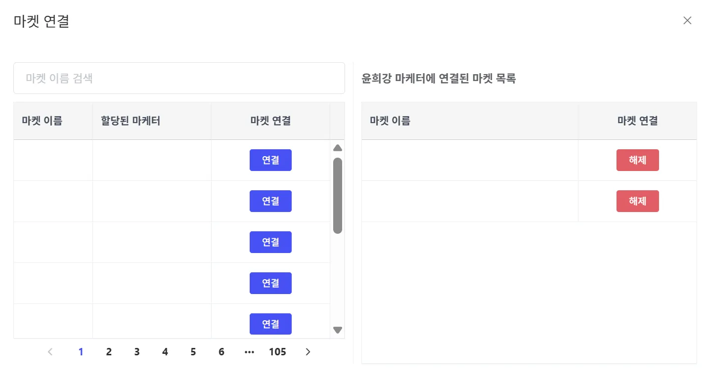 [연결] 클릭 시 좌측에서 대행사 전체 광고주 목록을 확인 할 수 있으며, 우측에서는 해당 마케터에게 연결된 광고주의 정보를 확인할 수 있습니다.