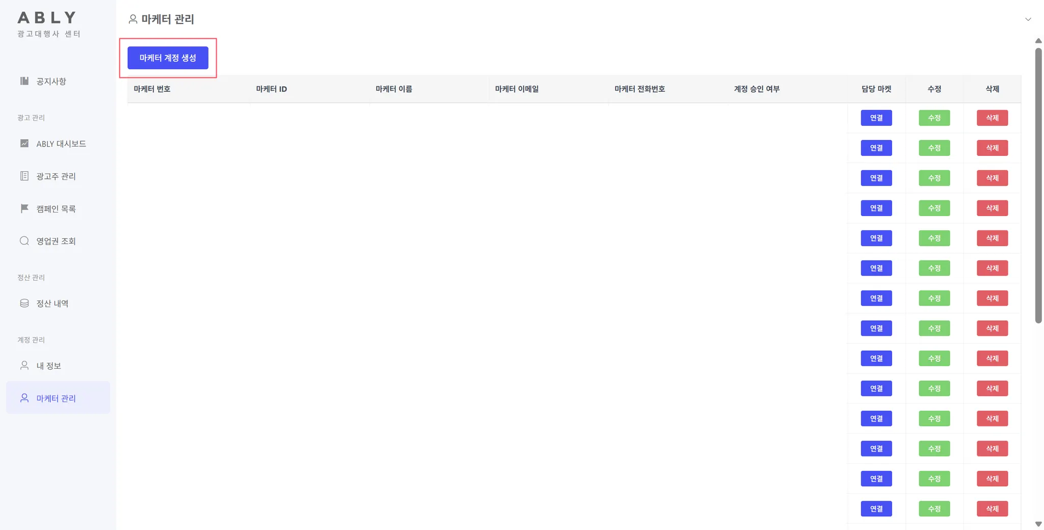 마케터 관리 페이지 진입 시 대행사에서 생성한 전체 마케터의 목록을 확인하실 수 있습니다.
