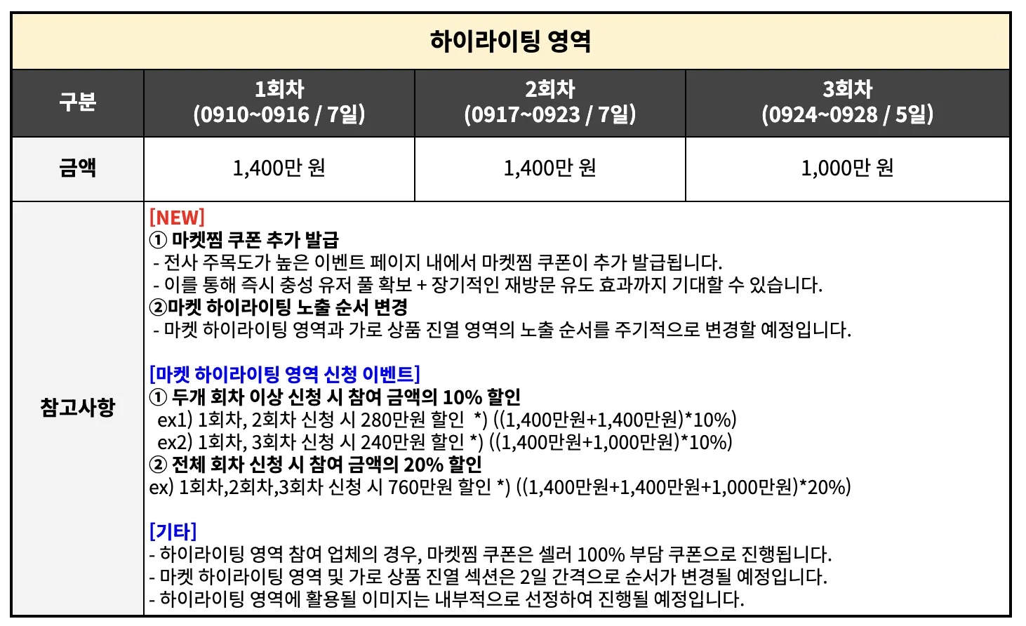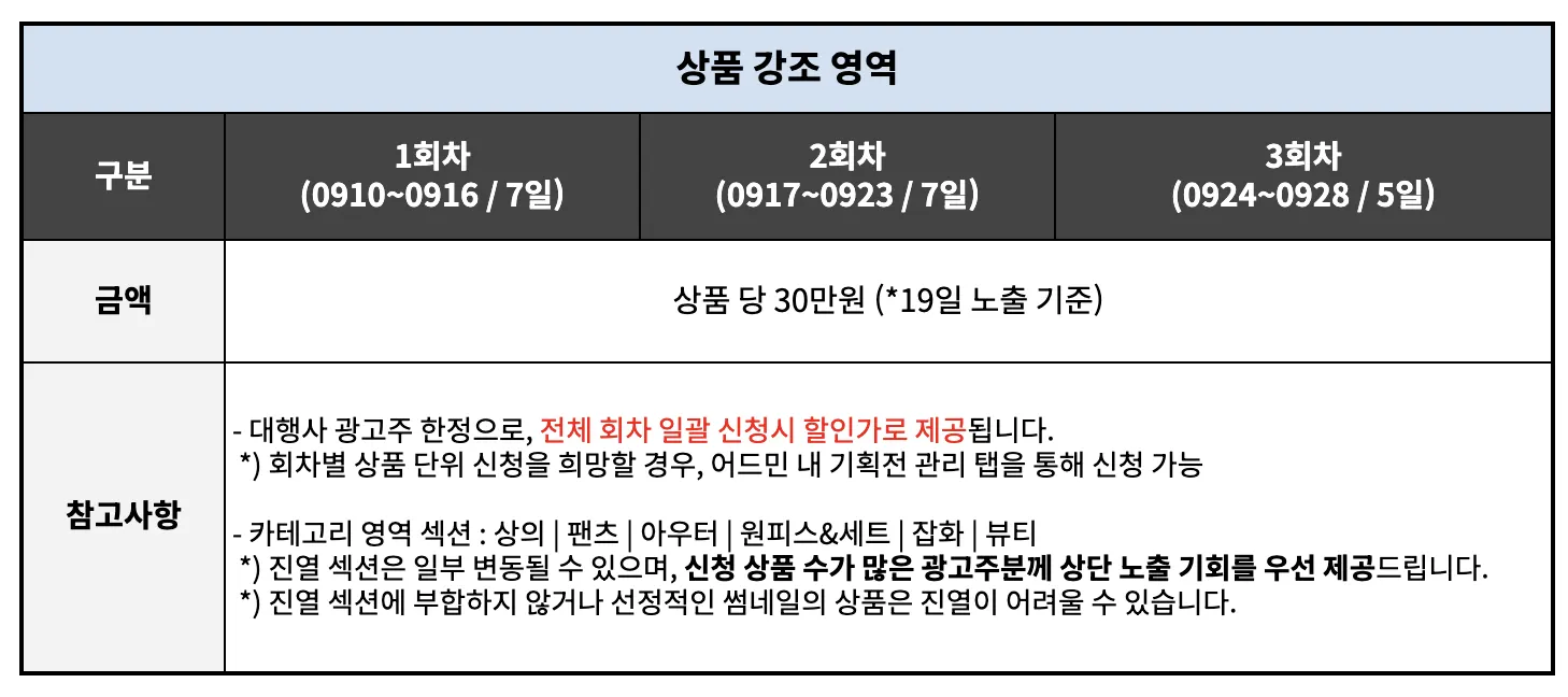 또한, 광고주 목적에 따라 마켓 브랜딩 중심의 하이라이팅 영역과 상품 중심의 상품 강조 영역 중 선택하여 참여하실 수 있습니다.