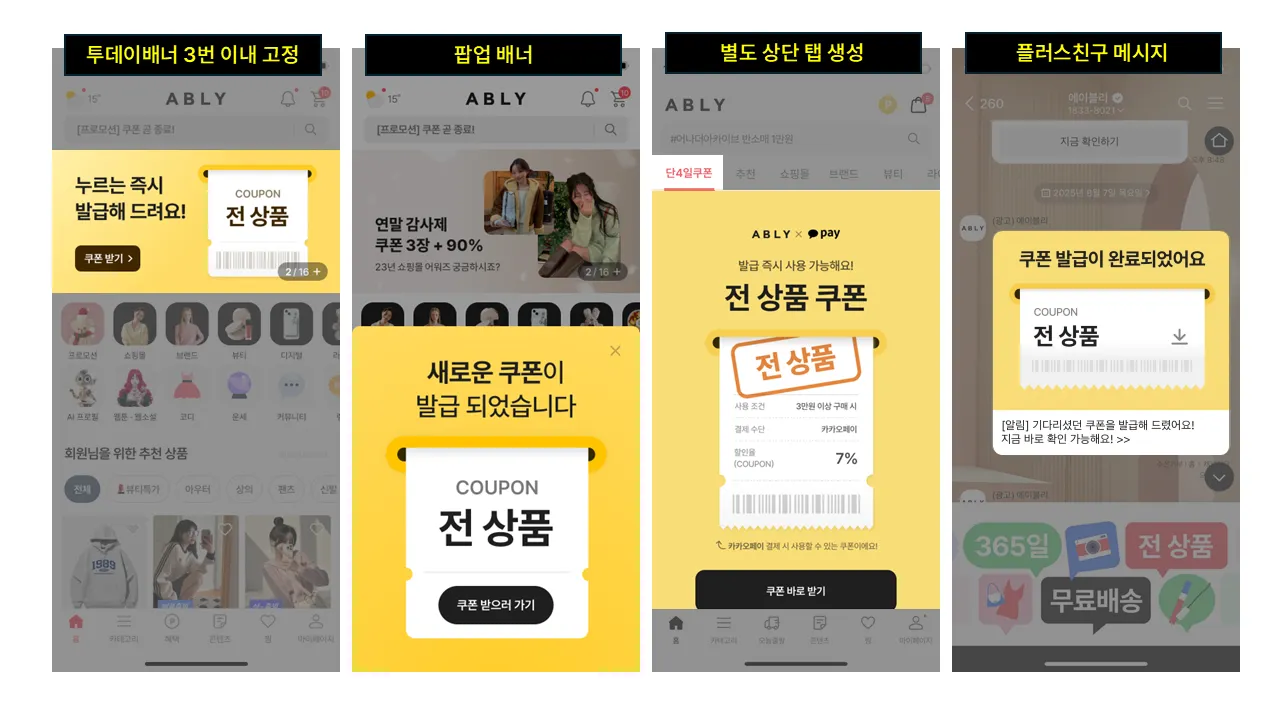 결제사 프로모션은 에이블리 전사 차원의 대형 이벤트 노출 구좌와 CRM 액션이 강력하게 집행됩니다.