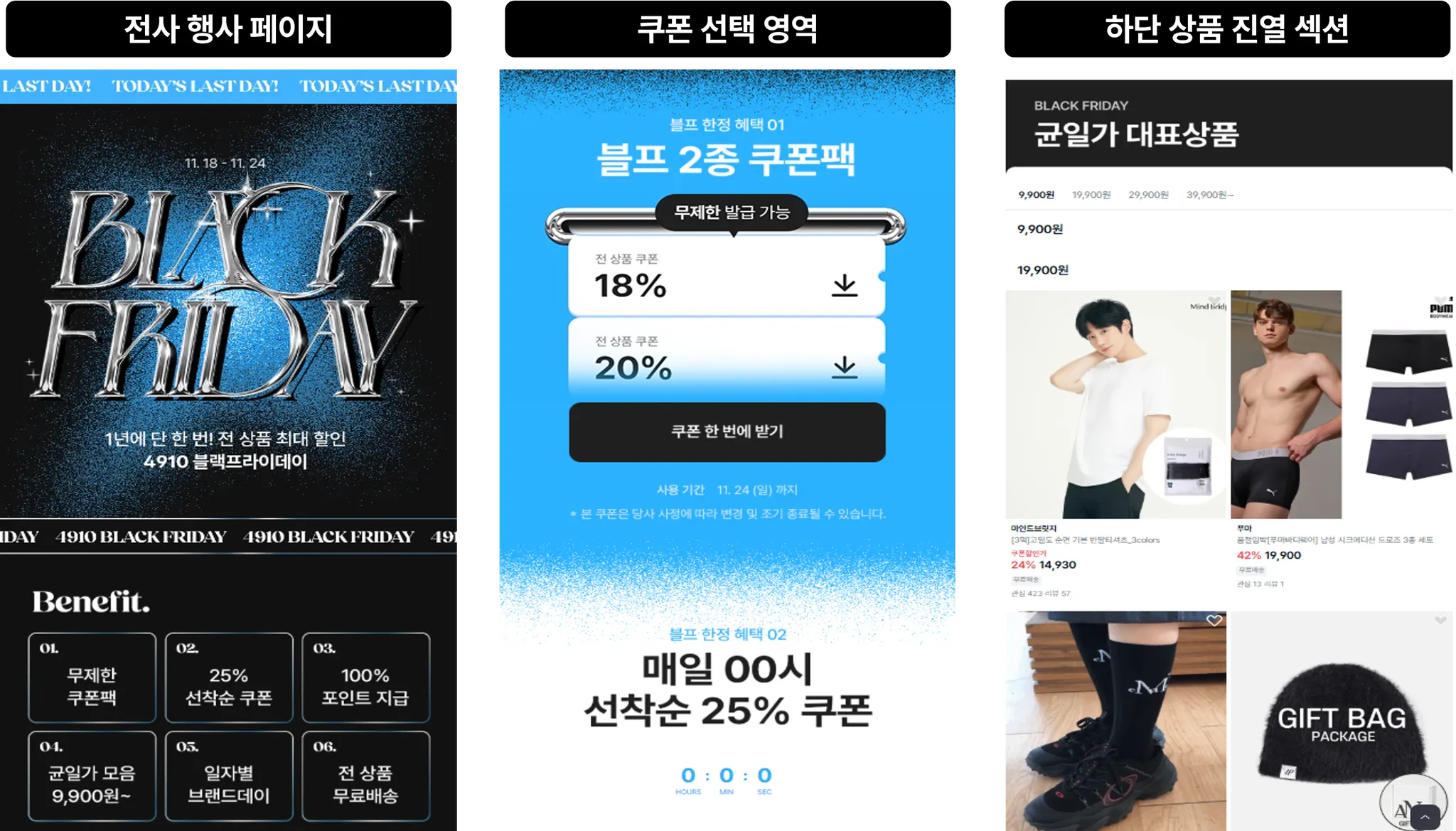 1년 중 최대 유저 유입과 거래액 갱신을 기대할 수 있는 4910 블랙프라이데이 행사 기간에 맞추어 메인 구좌에 상품을 노출하실 수 있습니다.