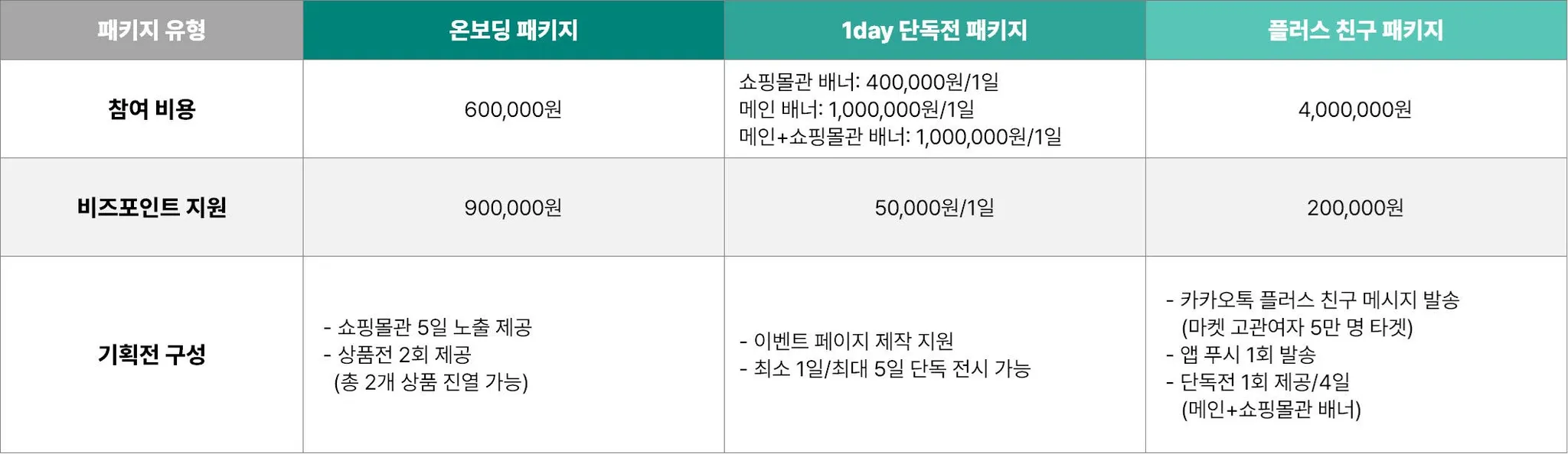매 기획전마다 개별 제안이나 세일즈를 반복할 필요 없이 패키지로 일괄 제안이 가능하며, 광고주 역시 합리적인 비용으로 다양한 구좌와 혜택을 확보할 수 있습니다.