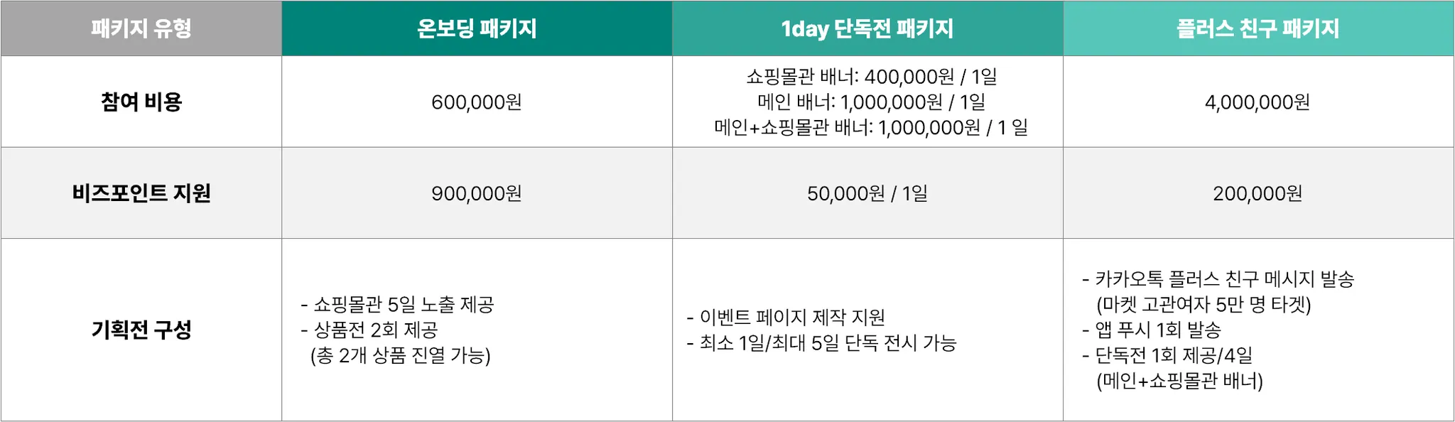 매 기획전마다 개별 제안이나 세일즈를 반복할 필요 없이 패키지로 일괄 제안이 가능하며, 광고주 역시 합리적인 비용으로 다양한 구좌와 혜택을 확보할 수 있습니다.