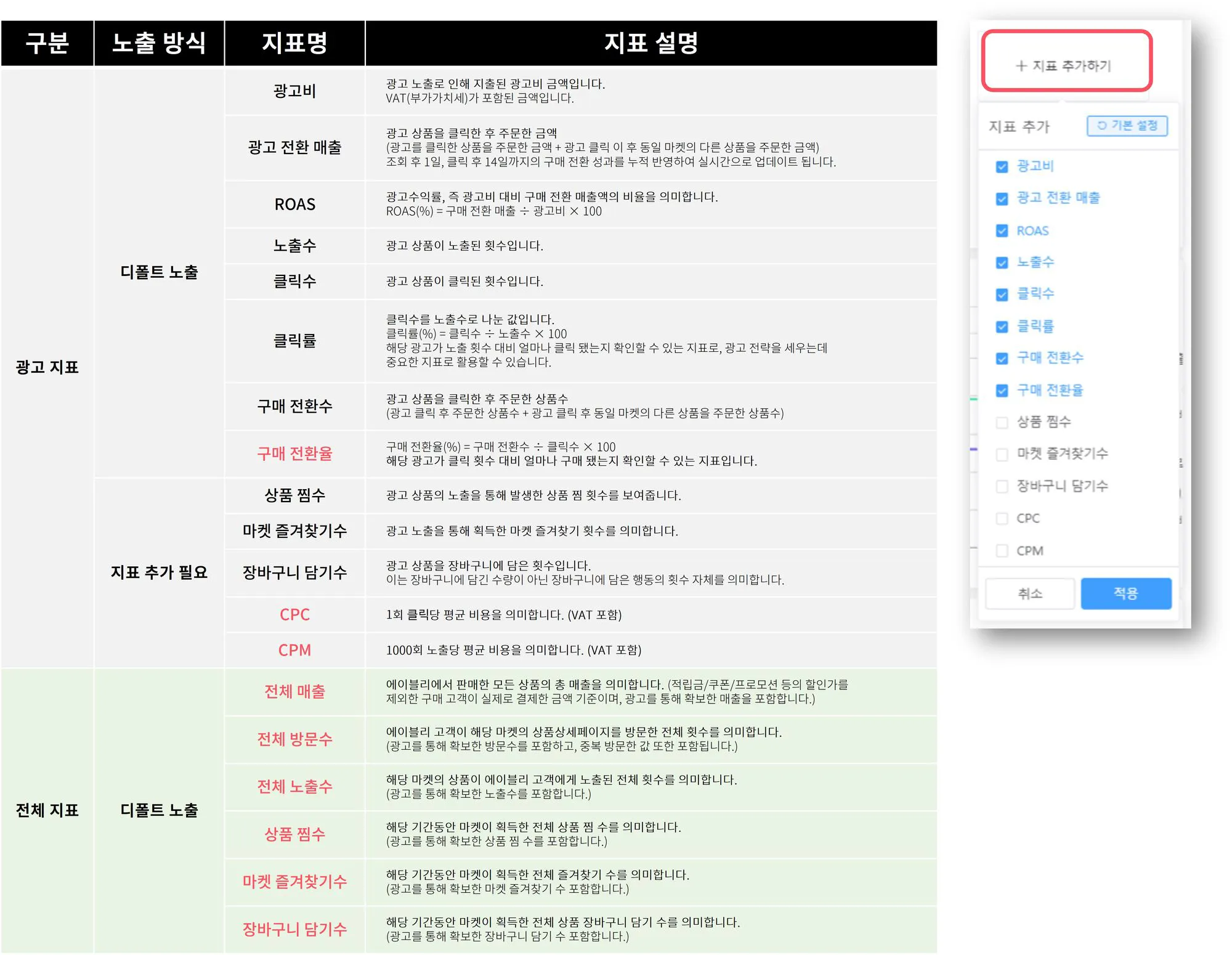 최초 디폴트로 보여지는 지표 : 광고비 / 광고 전환 매출 / ROAS / 노출수 / 클릭수 / 클릭률 / 구매 전환수 / 구매 전환율 (나머지 지표는 +지표 추가하기 버튼을 통해 추가할 수 있습니다.)