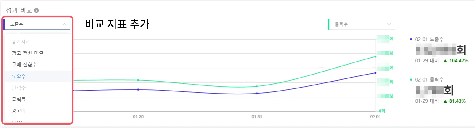 좌우측 양쪽에 있는 2가지 지표를 선정하여 광고 성과를 비교하여 분석해보세요!