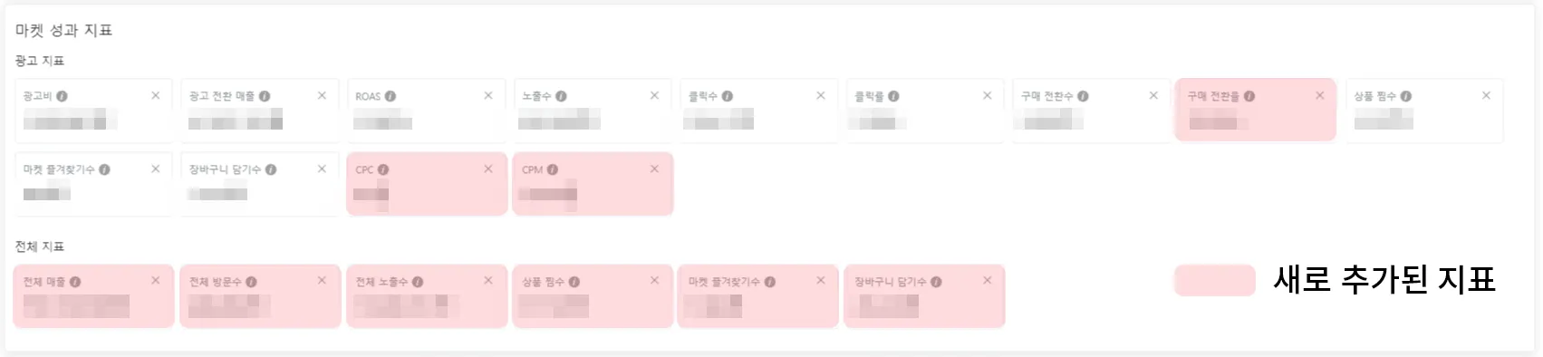 광고 지표 (6개) : 구매 전환율 / CPM / CPC / 마켓 즐겨찾기수 / 상품 찜수 / 장바구니 담기수