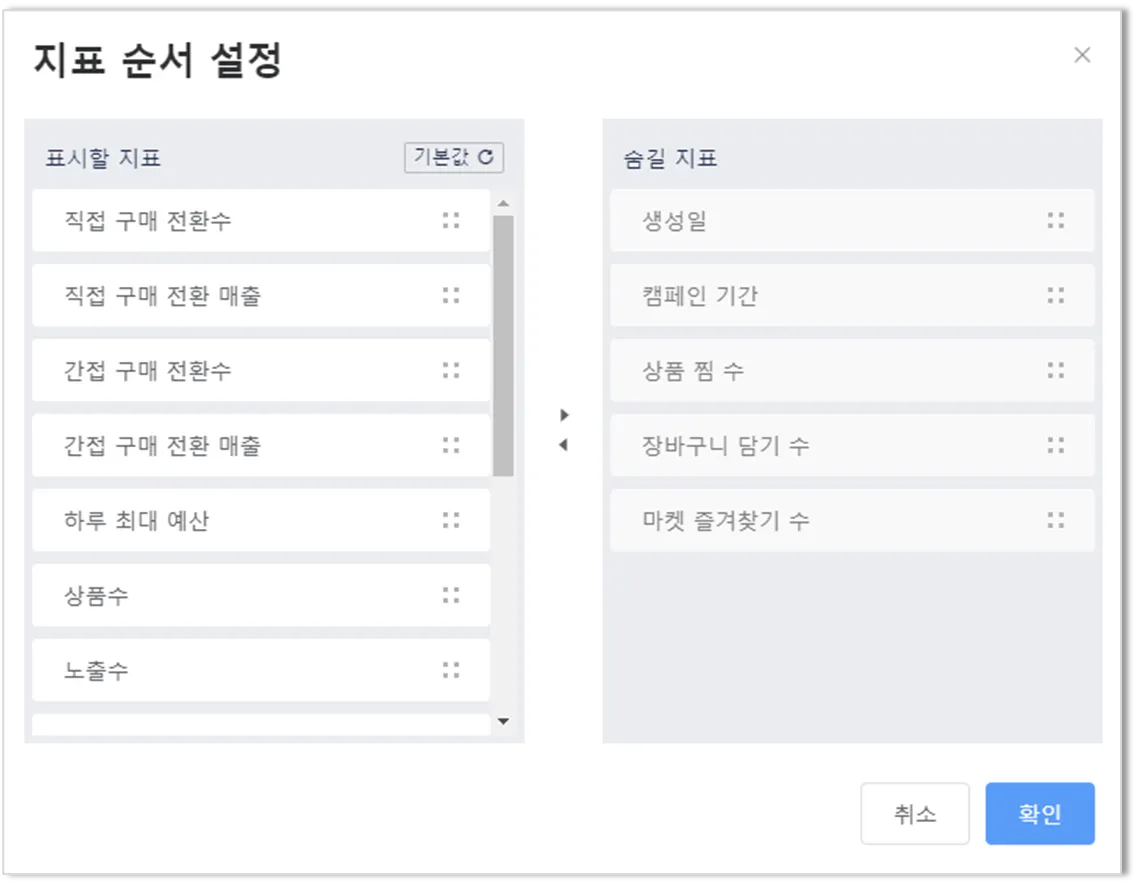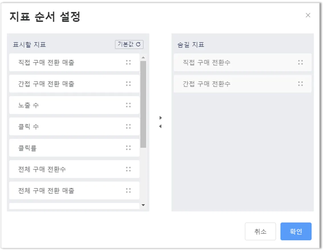 ‘숨길 지표’는 ‘표시할 지표’에서 드래그하여 옮겨주세요.