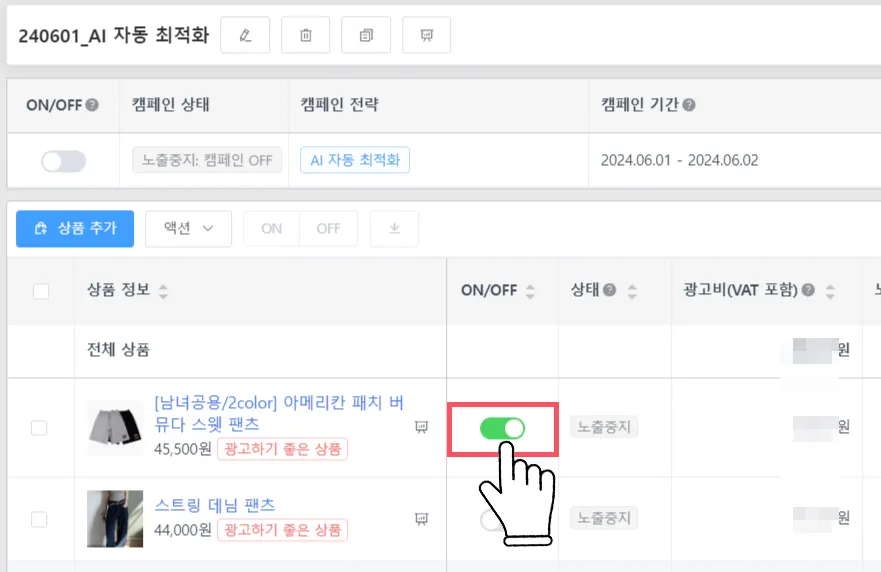 상품명 우측 ON/OFF 버튼 클릭 (녹색이면 ON, 회색이면 OFF 상태)