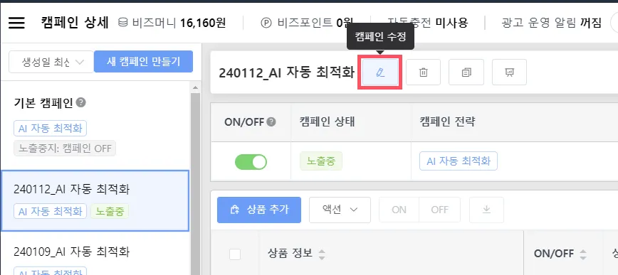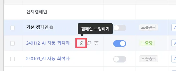 캠페인 관리에서 수정을 희망하시는 캠페인에 마우스 커서를 올린 후 수정 버튼을 클릭하시거나, 수정을 희망하시는 캠페인을 클릭하신 후 오른쪽에 위치한 [수정] 버튼을 클릭하면 손쉽게 캠페인 수정이 가능합니다.