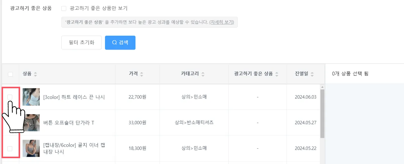 추가하고 싶은 상품 좌측 네모 박스 클릭 후 화면 최하단 ‘저장’ 버튼 클릭