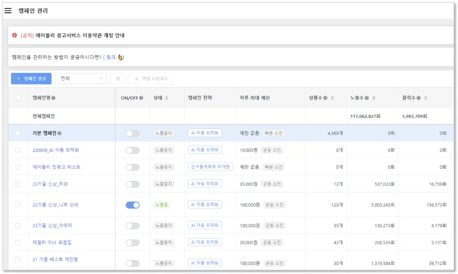 [광고 관리] > [캠페인 관리]를 클릭하시면, 현재 운영 중인 캠페인 리스트가 나타납니다. 수정을 희망하는 캠페인을 클릭해주세요