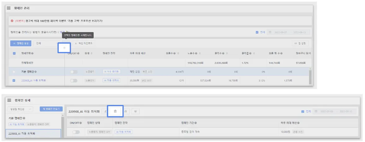 캠페인을 삭제하시고 싶으신가요? 아래 방법을 통해 캠페인 삭제가 가능합니다. [캠페인 관리]에서 삭제를 원하시는 캠페인에 마우스 커서를 올린 후 삭제 버튼을 클릭하시거나, 삭제를 원하시는 캠페인을 선택하신 뒤 삭제 버튼을 클릭하시면, 운영 중인 캠페인 중에서 특정 캠페인을 삭제할 수 있습니다. 단, 기본 캠페인은 삭제가 불가능 합니다.