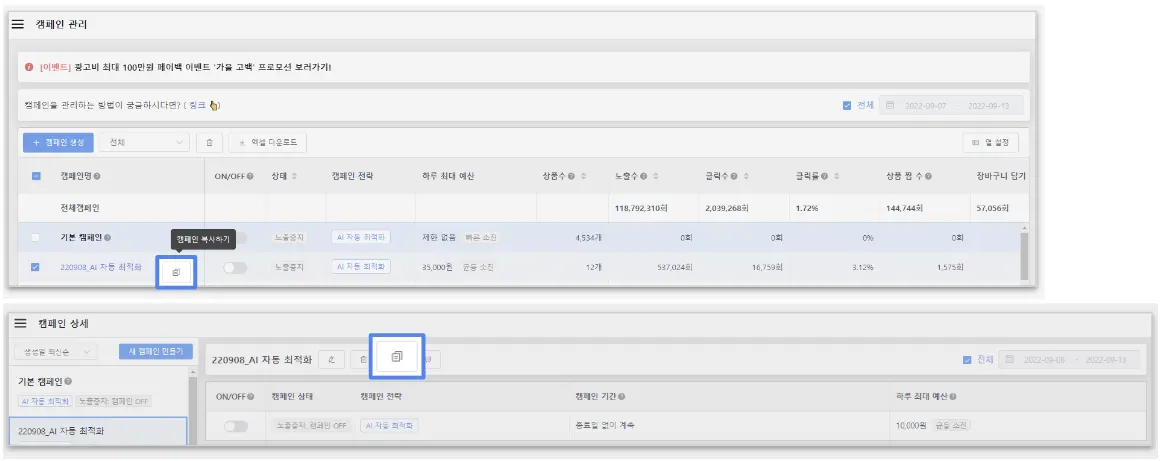 캠페인 관리에서 복사를 희망하시는 캠페인에 마우스 커서를 올려 복사 버튼을 클릭하시거나, 복사를 희망하시는 캠페인을 클릭하신 후 오른쪽에 위치한 [복사] 버튼을 클릭하면 손쉽게 캠페인 수정이 가능합니다.
