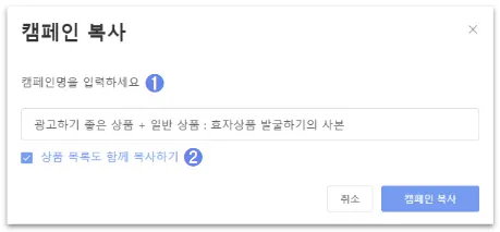 상품 목록도 함께 복사하기 : 체크 박스를 선택할 경우, 기존 캠페인의 상품 목록을 그대로 불러올 수 있습니다. : 체크 박스 해제 시, 기존 캠페인의 상품은 복사가 되지 않기 때문에 새로 추가해주셔야 합니다.