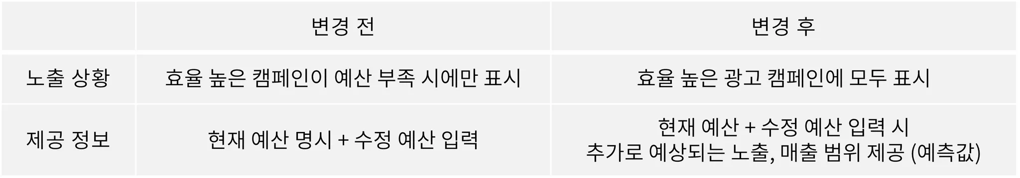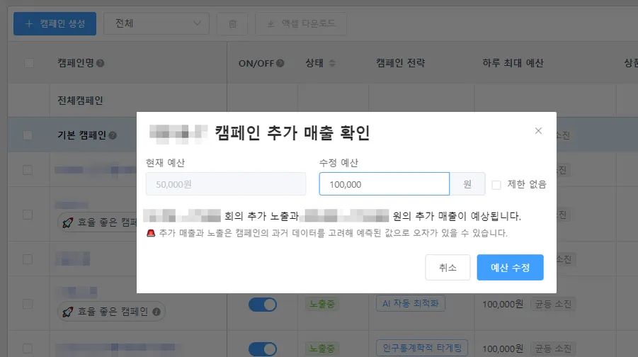 * 수정 예산 입력 시 하단에 예상되는 추가 노출값과 추가 매출값을 확인할 수 있습니다. (과거 데이터 기반 예측값이라 실제값과는 오차가 있을 수 있습니다.)