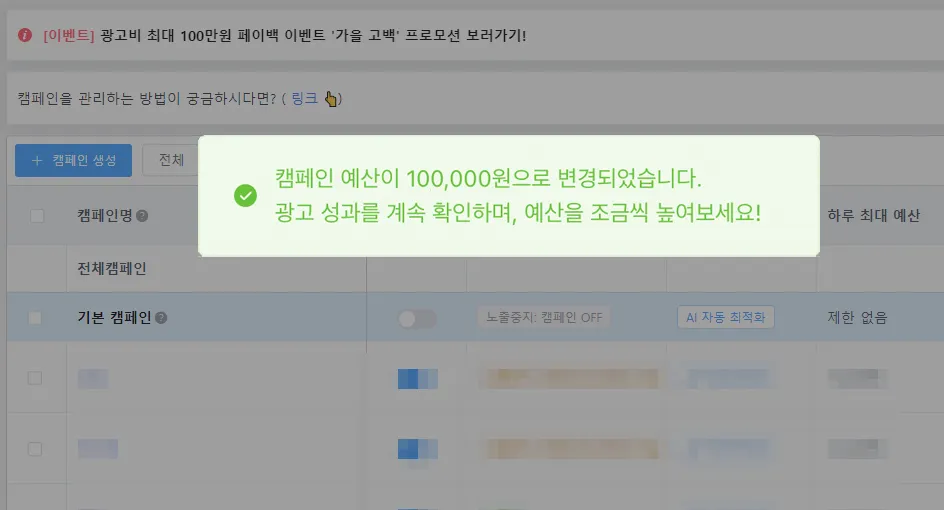 예산 증액 이후 광고 성과를 수시로 확인해주시고, 예산을 조금씩 상향 조정하면서 광고 매출을 높여보시기 바랍니다!