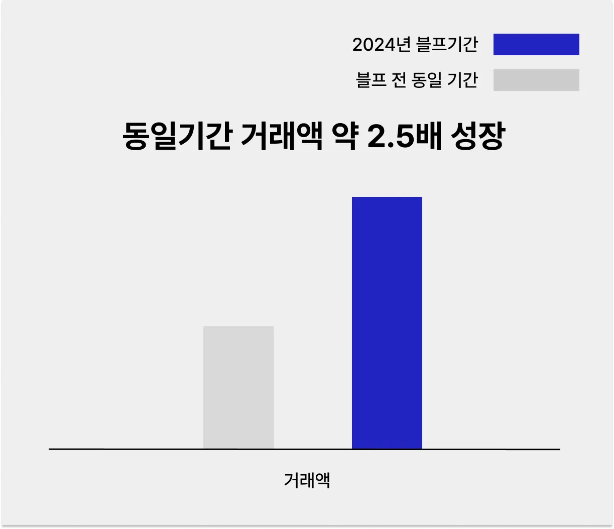 실제로 작년 블랙프라이데이 기간 전후를 비교해보면, 동일 기간 거래액이 약 2.5배 성장한 것을 확인할 수 있었습니다.