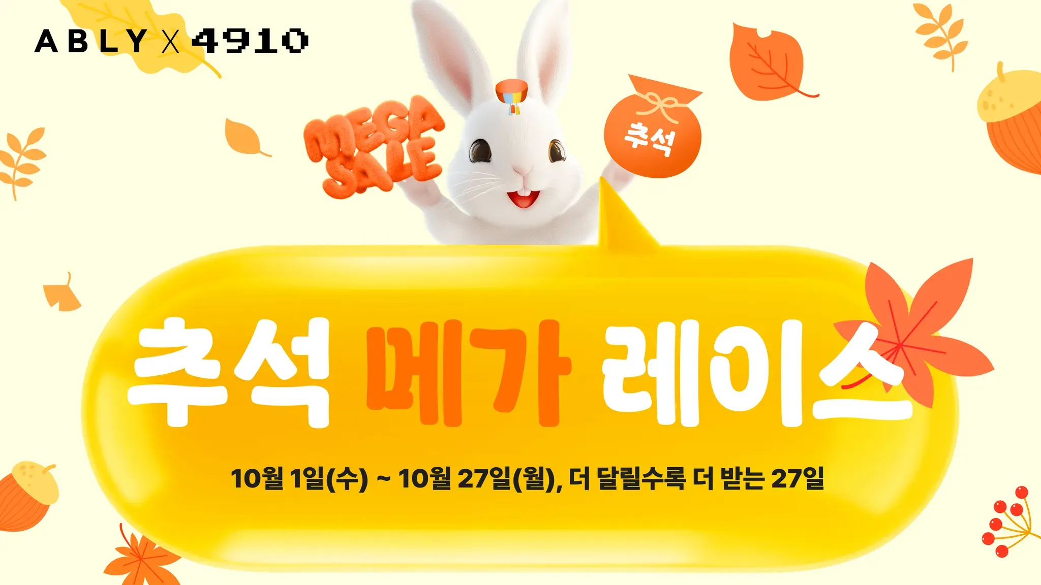 에이블리의 연중 대규모 행사인 메가세일과 추석이 맞물리는 10월, 한 달간 추석 메가 레이스 페이백 프로모션을 진행합니다. 이번 프로모션은 더 큰 혜택을 드리기 위해 페이백 한도 제한 없이 무제한 지급되며, 유효기간 또한 확대되어 운영됩니다.