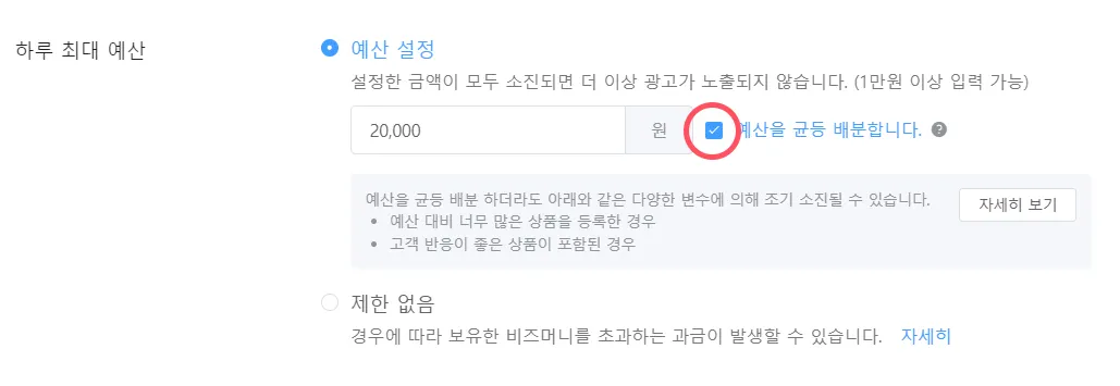 광고비는 빠른 소진 보다는 ‘하루 최대 예산 설정 + 예산 균등 배분 체크’ 를 권장합니다.