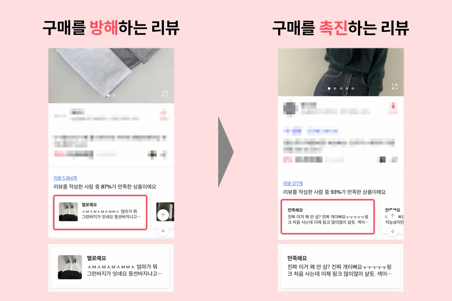 구매 고객의 부정적인 리뷰가 상위 노출되는 경우 구매 전환의 치명적인 장애 요소가 될 수 있고, 리뷰가 한 건도 없는 경우에도 구매를 쉽게 결정하지 못하는 요인이 될 수 있습니다.